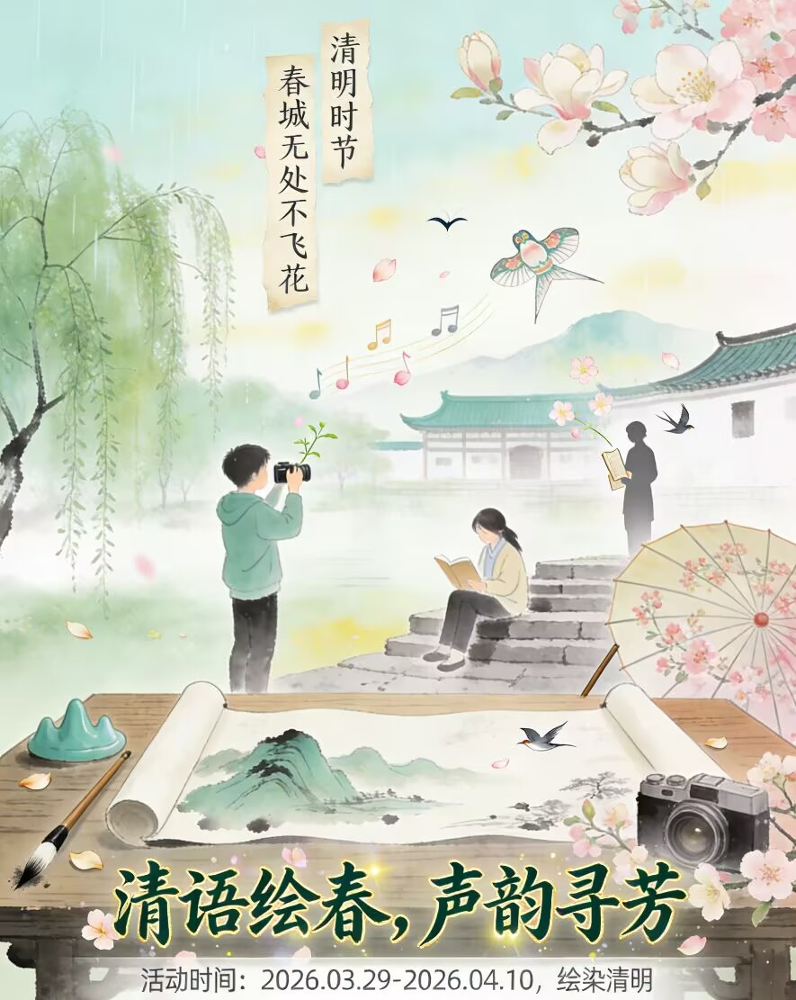 2026年3月,淮阴师范学院"清语绘春,声韵寻芳"清明主题创作活动正式拉开帷幕。活动面向全校学生,将持续至4月10日,旨在以多元创作形式让学生在清明节气中探寻传统文化内涵,表达春日美好感悟。活动负责人朱乐乐、费筱筱统筹组织,语盟具体承办。